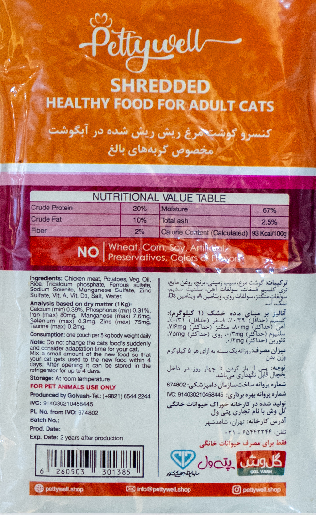 این غذای رشتهای از گوشت خالص مرغ در عصارهای طبیعی تهیه شده تا گربهات هم از طعمش لذت ببره و هم بدنش تغذیهای کامل بگیره. با ۲۰٪ پروتئین و ۱۰٪ چربی، عضلات رو تقویت میکنه و انرژی لازم برای بازی، پرش و تحرک روزانه رو فراهم میسازه. تورین افزودهشده سلامت چشم و قلب رو تضمین میکنه، و وجود ویتامینها و مواد معدنی به درخشش مو و پوست کمک میکنه. بدون ذرهای غلات یا افزودنی مصنوعی، مناسب برای گربههای حساس یا دارای آلرژی غذایی.