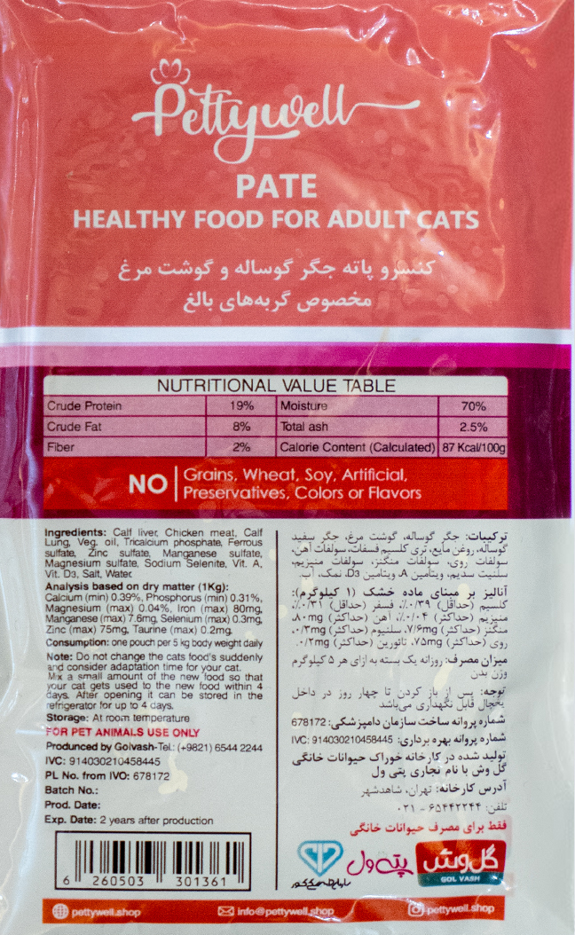 پتهی جگر گوساله و مرغ پتیوِل با بافتی نرم و عطر طبیعی گوشت، مخصوص گربههایی است که هم طعم عمیق گوشت را دوست دارند و هم به تغذیهای کامل نیاز دارند. با ۱۹٪ پروتئین خالص و ۸٪ چربی متعادل، این پته هم انرژی مورد نیاز روزانه را فراهم میکند و هم به سلامت قلب و عضلهها کمک مینماید. جگر گوساله منبع غنی از آهن، ویتامین A و زینک است که سیستم ایمنی و شفافیت پوست و مو را تقویت میکند. بدون غلات و افزودنی مصنوعی، برای گربههای حساس، عالی و ایمن است.